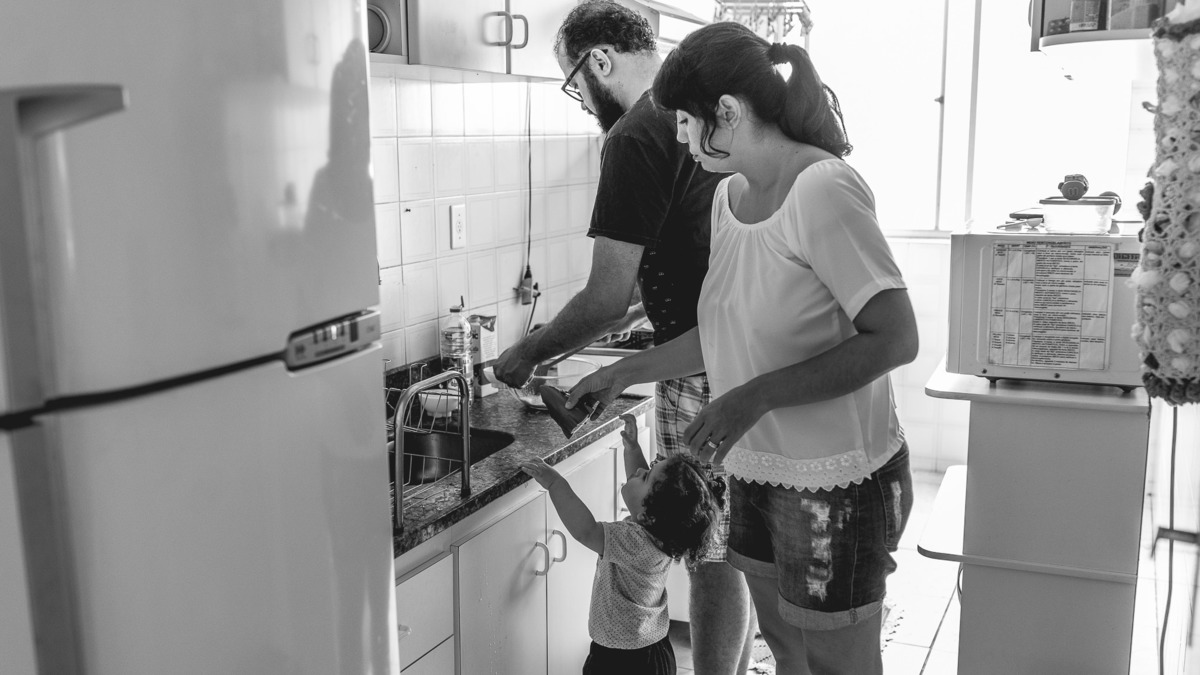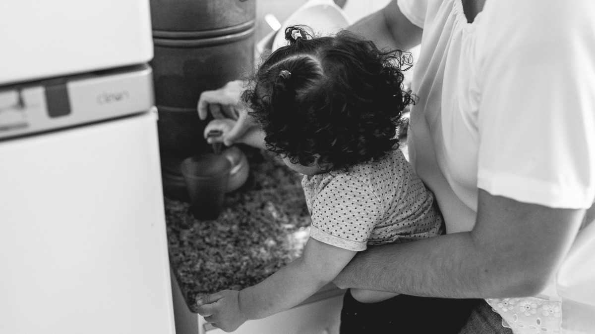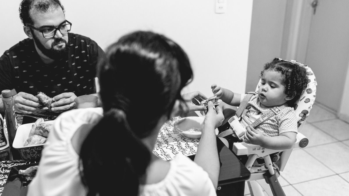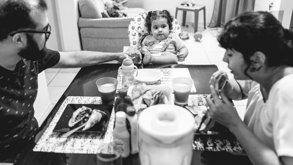 Numa tarde chuvosa de domingo não deu para descerem pro parquinho do prédio que a Rafaela tanto gosta, então o jeito foi se divertirem dentro do apartamento mesmo. Enquanto a pequena brincava com a mãe entre uma mamada e outra, o papai foi para a cozinha. Rodolpho me confidenciou que cozinhar tem sido um dos seus hobbies preferidos. Nesse dia ele fez esfirra de carne, com direito a massa fresca feita por ele. Se divertindo na cozinha, Rafa teve interesse em experimentar limão e nos rendeu altas risadas com suas caretas. Quando o lanche ficou pronto se reuniram em volta da mesa para mais um momento em família. Rafaela muito sapeca só quis ficar com os pés em cima da mesa. Katarina disse que foi a primeira esfirra que a pequena comeu. E assim , depois do lanche me despedi dessa família com a certeza de que o importante são esses pequenos momentos e o amor que eles tem um pelo outro são de encher o coração de qualquer pessoa.
