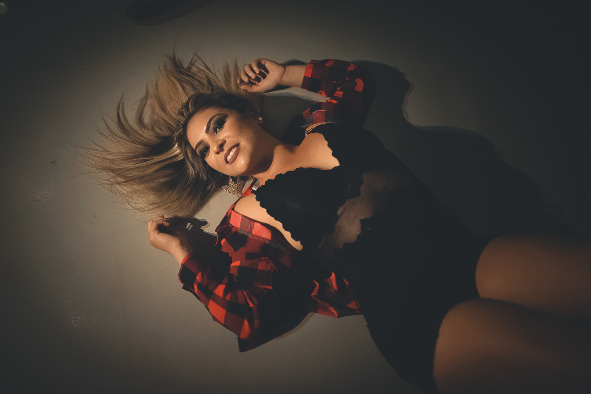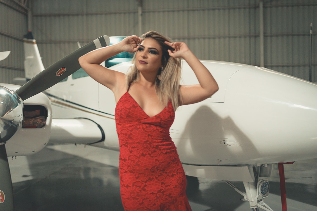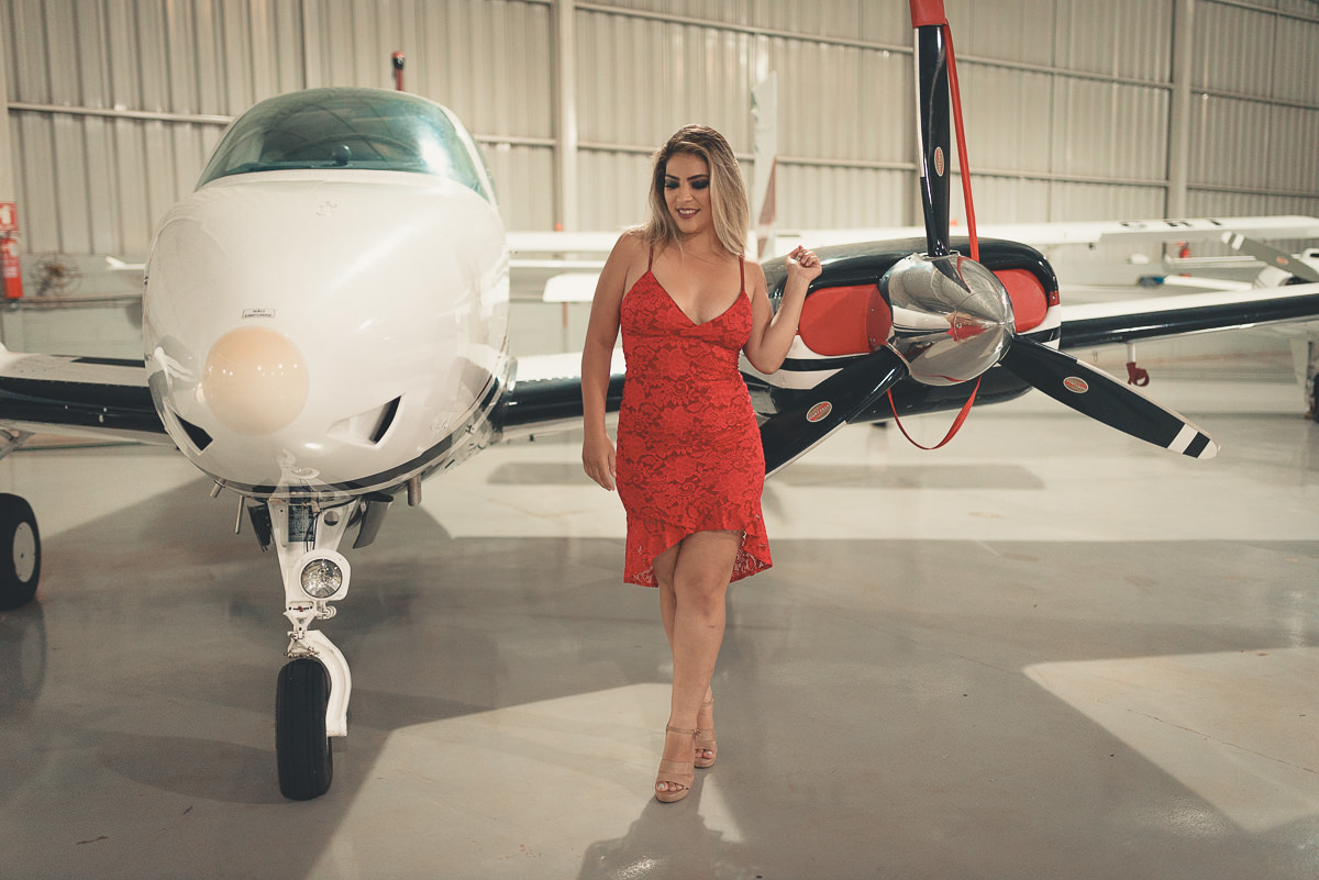 Estávamos em um hangar e o tempo fechou completamente, a luz linda que tínhamos foi embora. Ainda bem que tínhamos a parte de dentro onde os aviões são guardados para fotografar, o que não é do meu costume fazer ensaios em lugares fechados.